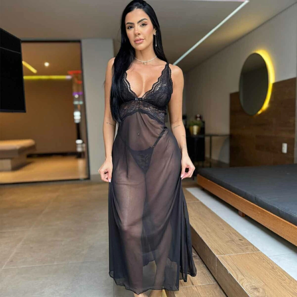 Camisola Longa Sensual Tule Transparente Sem Bojo