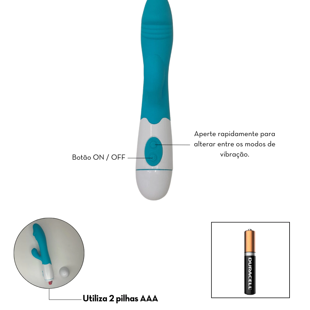 Vibrador ponto G, com estimualdor clitoriano em formato flor Bateria: Utiliza 2 pilhas AAA (não inclusas) Desempenho: 10 modos de vibração Medidas aprox.: 200 x 42 x 33 mm